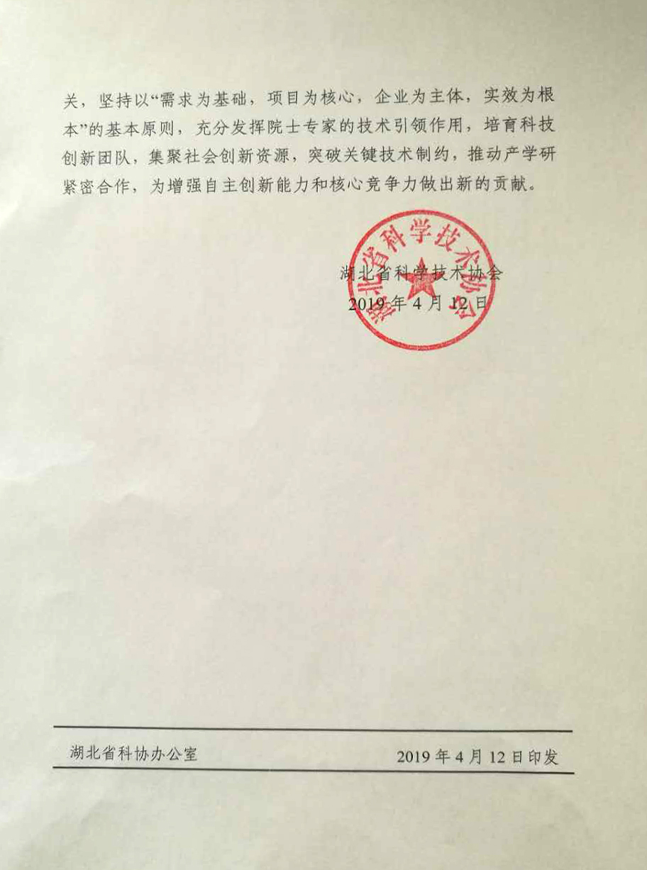 2019年4月12日,湖北省科協(xié)根據(jù)《中國科協(xié)關于推進院士專家工作站建設指導意見》及相關要求,經審定,鑫溢公司院士專家工作站具備建站條件,同意鑫溢公司與白志民教授及其團隊組建院士專家工作站。